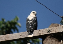 Descrição: Mede de 47 a 51 cm de comprimento, peso de 600-650 g (macho) e 710-855 g (fêmea) (Márquez et. al, 2005). Adulto é todo branco com dorso negro com manchas brancas, cauda curta preta com uma larga faixa terminal branca; íris castanho-escuro, cera cinza-azulado e tarsos amarelo-claras. Sua voz é um assobio fino e longo.