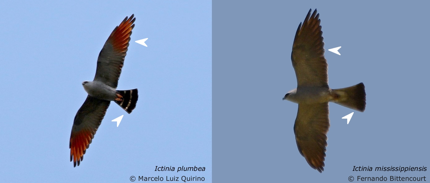 Em voo são mais facilmente diferenciáveis, Ictinia plumbea adulto é identificado pelas primárias avermelhadas e pela cauda barrada, características ausentes no Ictinia mississippiensis adulto, que possui primárias escuras e cauda preta sem barras. Já os jovens de ambas espécies possuem a cauda barrada, distinguindo-se pelo avermelhado das primárias, presente no jovem I. plumbea e ausente no jovem I. mississippiensis.