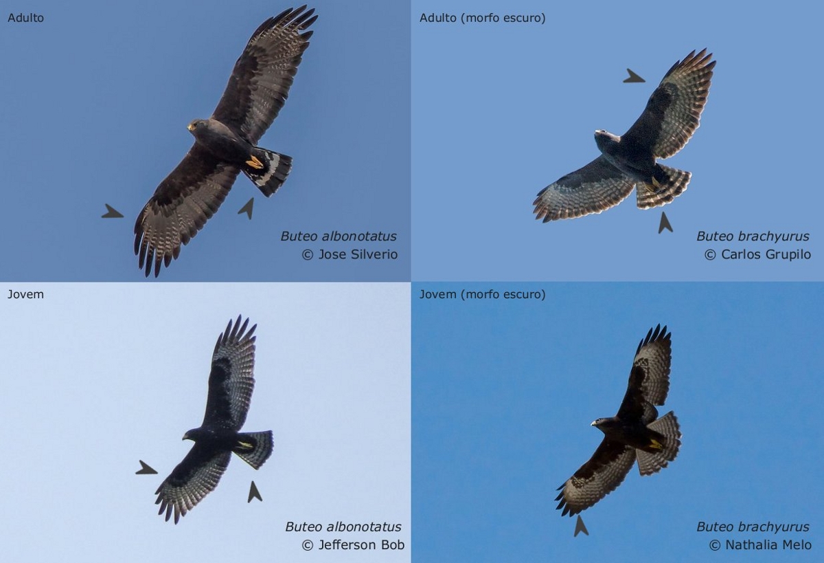 Os jovens são mais confundíveis, ambos possuem a cauda e as penas de voo (primárias e secundárias) cinzentas e finamente barradas, além de pintas claras pelo corpo (mais comum em B. albonotatus e pouco frequente no B. brachyurus morfo escuro). A silhueta e a área clara na base das primárias são os caracteres mais confiáveis para diferenciar o jovem B. brachyrus morfo escuro do jovem B. albonotatus.