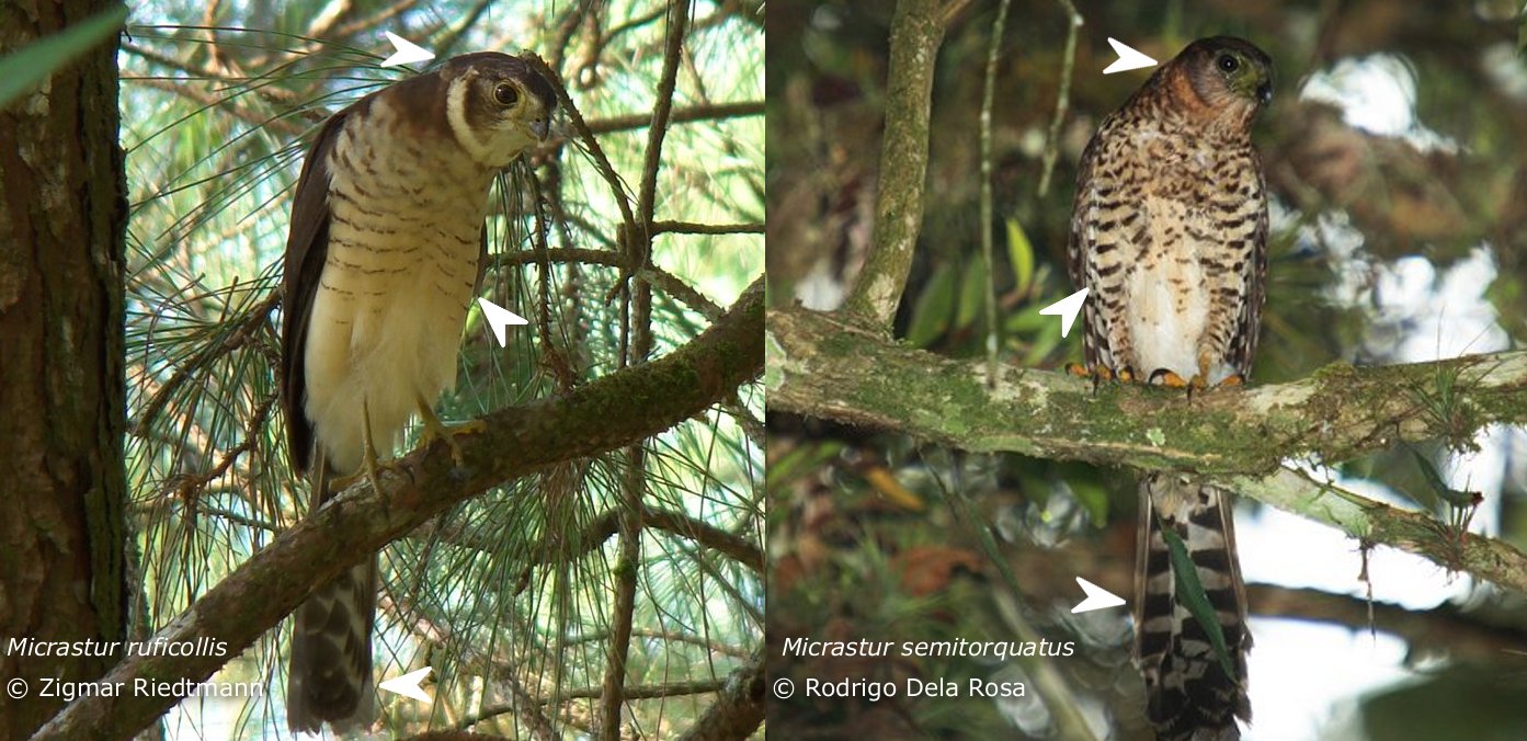 Jovens: Falcão-caburé (Micrastur ruficollis) x Falcão-relógio (Micrastur semitorquatus)