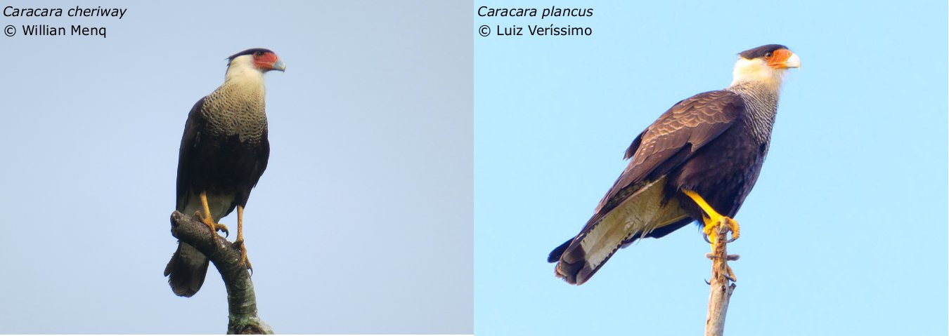A maneira mais segura de diferenciar as duas espécies é pela área de ocorrência, C. cheriway ocorre do norte do rio Amazonas até o sul dos Estados Unidos, enquanto que o C. plancus ocorre do sul do rio Amazonas até o extremo sul da Argentina. Porém, na zona de contato das duas espécies (Amazônia central ao longo do rio Solimões/Amazonas) pode haver indivíduos híbridos ou sobreposição das espécies, sendo mais prudente a identificação a nível de gênero (Caracara sp) nessa região.