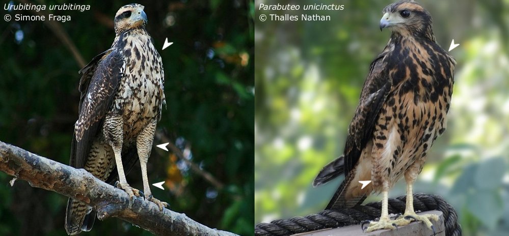 Os jovens nas mudas iniciais são parecidos, Urubitinga urubitinga é identificado pelo corpo mais esguio, tarsos compridos e calções bem barrados (barras finas e escuras), enquanto que o Parabuteo unicinctus possui calções sem barrado ou com barrado claro/ferrugíneo discreto. Dependendo da idade do P. unicinctus, pode apresentar também calções levemente ferrugíneos, contrastando com o restante do corpo. Nota-se também, que U. urubitinga possui as bochechas, garganta e peito mais claros, com poucas estrias, enquanto que P. unicinctus é mais marcado com estrias peitorais densas, e pintas regulares no abdómen.