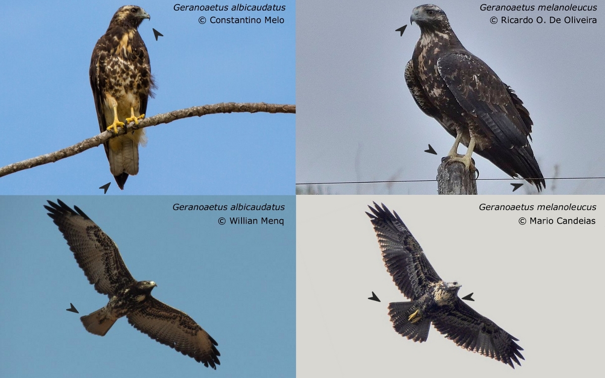 As plumagens dos primeiros anos dessas aves são bem parecidas, especialmente quando pousadas. Para diferenciar esses dois jovens em suas “mudas” iniciais é importante atentar-se as formas e as proporções. Pousado, Geranoaetus melanoleucus é identificada pelo porte mais robusto, dedos e tarsos grossos, bico grande e calções barrados. Já Geranoetus albicaudatus, possui o corpo mais esbelto, bico menor, tarsos e dedos menos possantes, e ponta das asas sobressalientes em relação a extremidade da cauda (na G. melanoleucus a ponta das asas raramente ultrapassa o final da cauda).