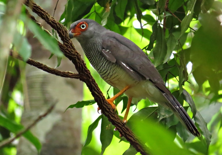 Descrição: De pequeno porte, mede 33-38 centímetros de comprimento, peso de 172-223 g (Bierregaard & Boesman, 2013). Possui plumagem cinza predominante; adulto com cabeça e o dorso cinza, ventre branco finamente barrado de cinza; cauda cinza-escuro com duas finas faixas brancas; íris branca, além da cera bico e tarsos de coloração laranja-avermelhado. O jovem apresenta o ventre mais branco com pouco ou sem barramento, tarsos e cera amarelo, e íris cinza-azulado.